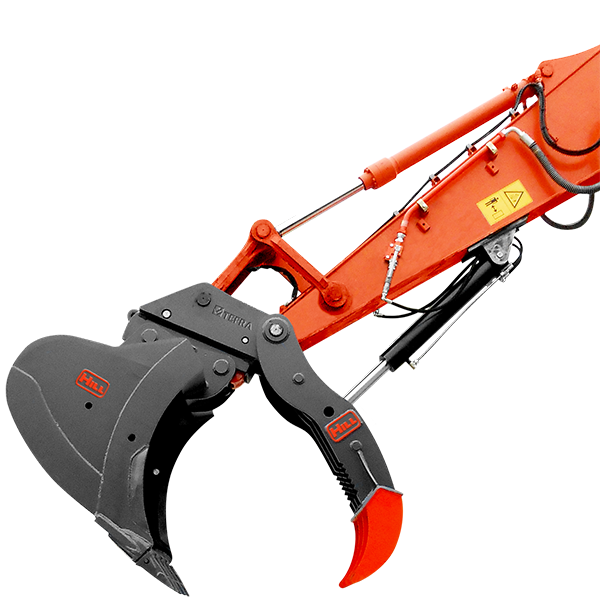 Hill Engineering offer the Thumb in both dipper arm mounted rotation and coupler front pin mounted rotation options. Each Thumb will be specifically designed to fit your coupler, bucket and machine type giving the operator security in the knowledge that he can grab and hold materials with full confidence that the system has been designed and built for their machine setup. The Thumb comes with a built in cross line relief valve for protection against excess forces from bucket crowding, heavy duty rams to prevent buckling & spherical bearings in the rams to allow for heavier loads.